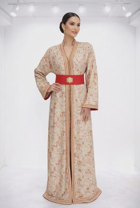 تكشيطة بيج بنقوش تقليدية مع حزام أحمر أنيق