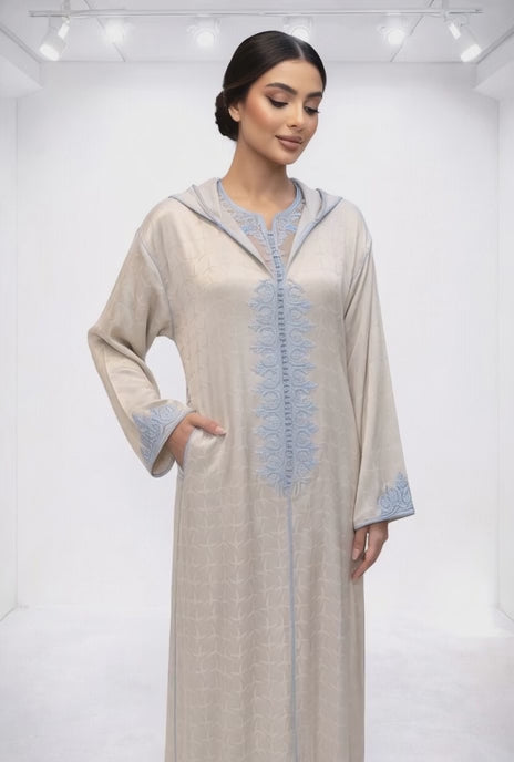 جلابة أنيقة بلون بيج بتطريز أزرق راقي