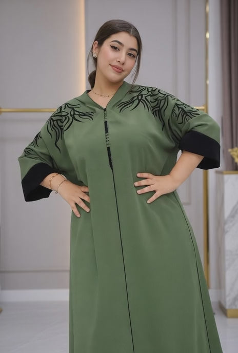 جلابة خضراء عصرية بتطريز راقي بالأسود