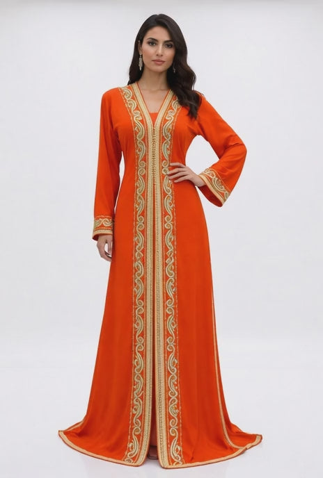 قفطان "شروق المنارة" البرتقالي بتطريز ذهبي انسيابي