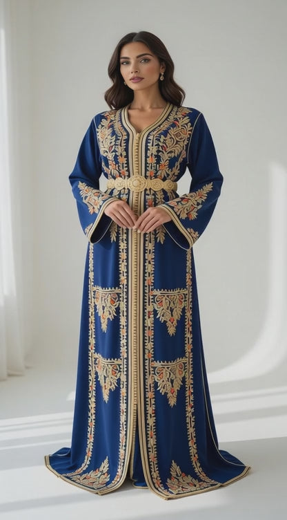 إطلالة تشع بالأنوثة والرقي مع قفطان يجمع بين فخامة اللون الأزرق الملكي ودقة التطريز اليدوي. صُمم هذا القفطان بـ "شغل المعلم" على طول القطعة مع ترصيع يدوي بأحجار ملونة تزيد من بريقه وتجعلكِ نجمة الحفل.